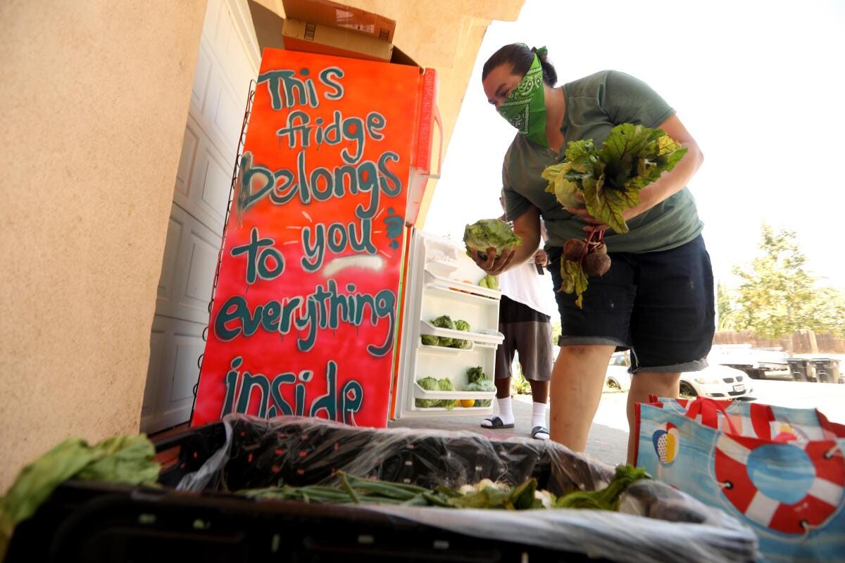 “Los Angeles Community Fridges is a network of decentralized, independent refrigerators and pantries that provide food and vital supplies to our communities through mutual aid. Our mission is to strengthen communities & redistribute existing resources by providing tools and frameworks to ensure people-supported, ongoing, equal access to healthy food.”